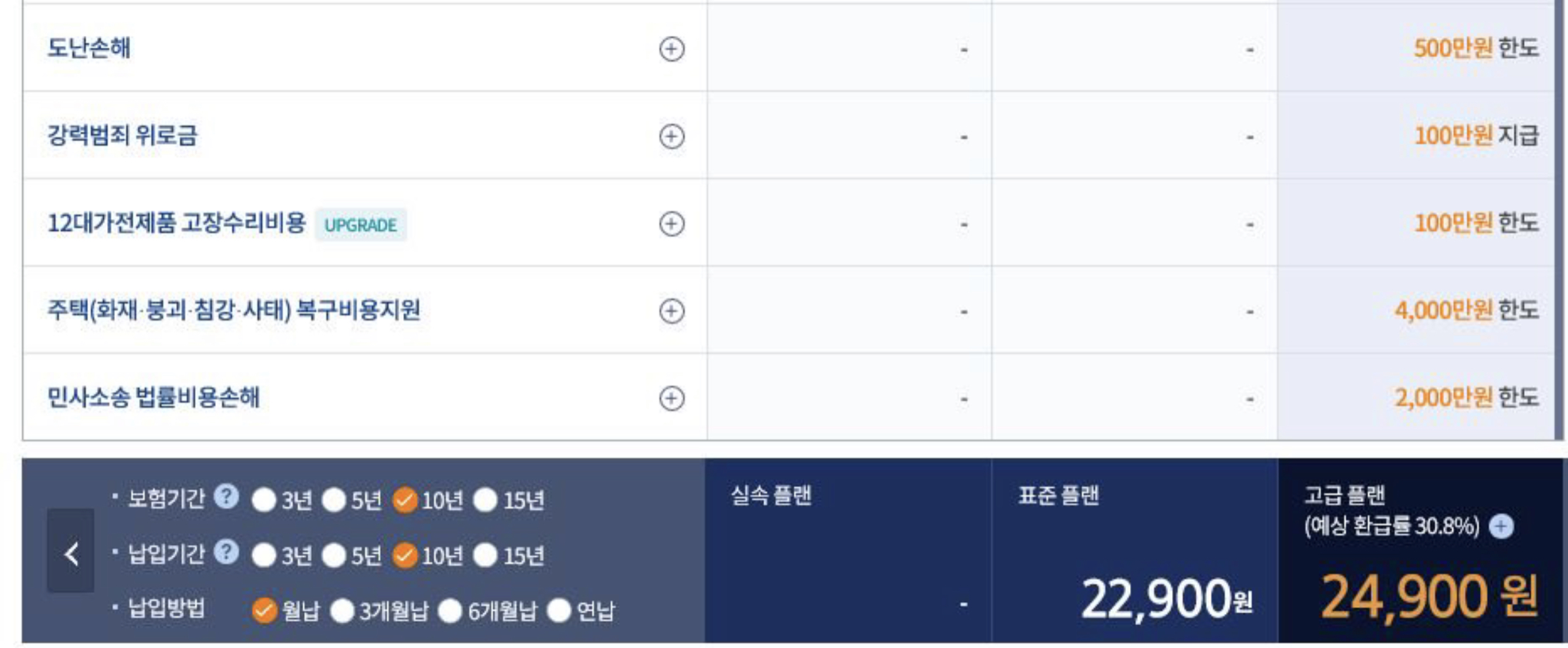 환급금액은 사실 보험회사마다 다른데 비슷한 조건으로 다른 보험사의 견적을 받아봤을 때 보험료는 2배 정도 비싼 경우가 있었는데 그 경우에는 환급률이 높았습니다. 본인의 선택에 맞게 보험회사를 선택하시면 좋을 것 같습니다. 이 화면에서는 각각의 보장명에 대한 설명이 상세히 나와 있고 각 보장내역의 한도도 볼 수 있으니 손쉽게 어떤 구성을 갖고 있는지 보기 편리했습니다. 저의 경우에는 앞서 말씀드린바와 같이 누수와 가전제품 수리비를 특약으로 하고 싶었는데 고급플랜을 선택할 경우 아래와 같이 추가 보장이 가능합니다.
