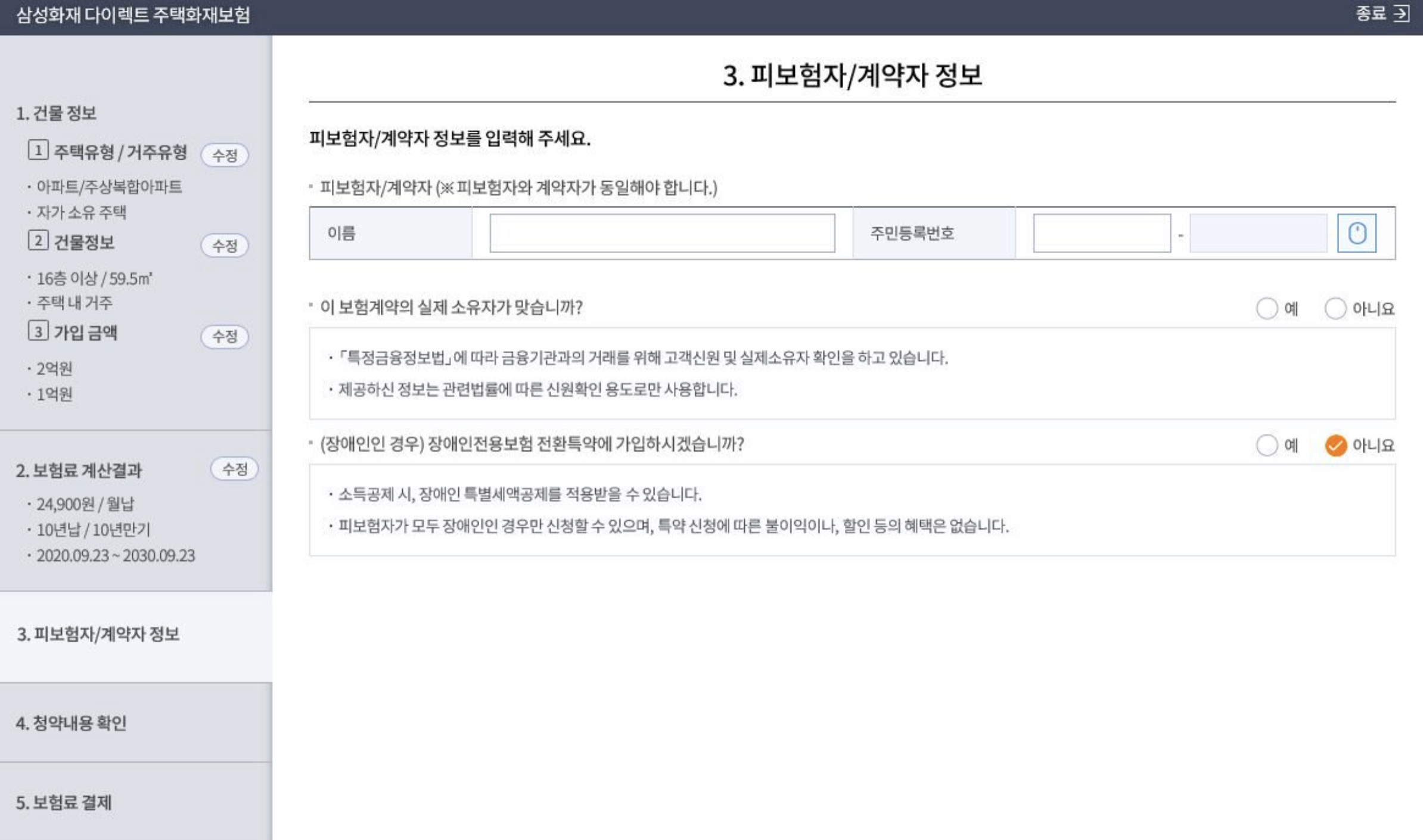 여기에서 특히 마음에 들었던 것은 가전제품 고장 수리비용이 다른 곳의 경우에는 6대 가전제품으로 TV, 냉장고와 같은 가전제품인데 삼성화재의 경우에는 공기청정기도 포함되어 있어 요즘 같이 공기청정기가 필수인 시대에는 좋은 선택이 될 것이라고 생각합니다. 또한 법률비용이나 강력범죄와 같이 일어나면 안되겠지만 그런 경우에도 보장 받을 수 있는 상품이니 참고하시기 바랍니다. 본인이 원하시는 플랜을 선택하시고 다음으로 넘어가면 피보험자와 계약자 정보 등 개인 정보를 입력하게 됩니다.