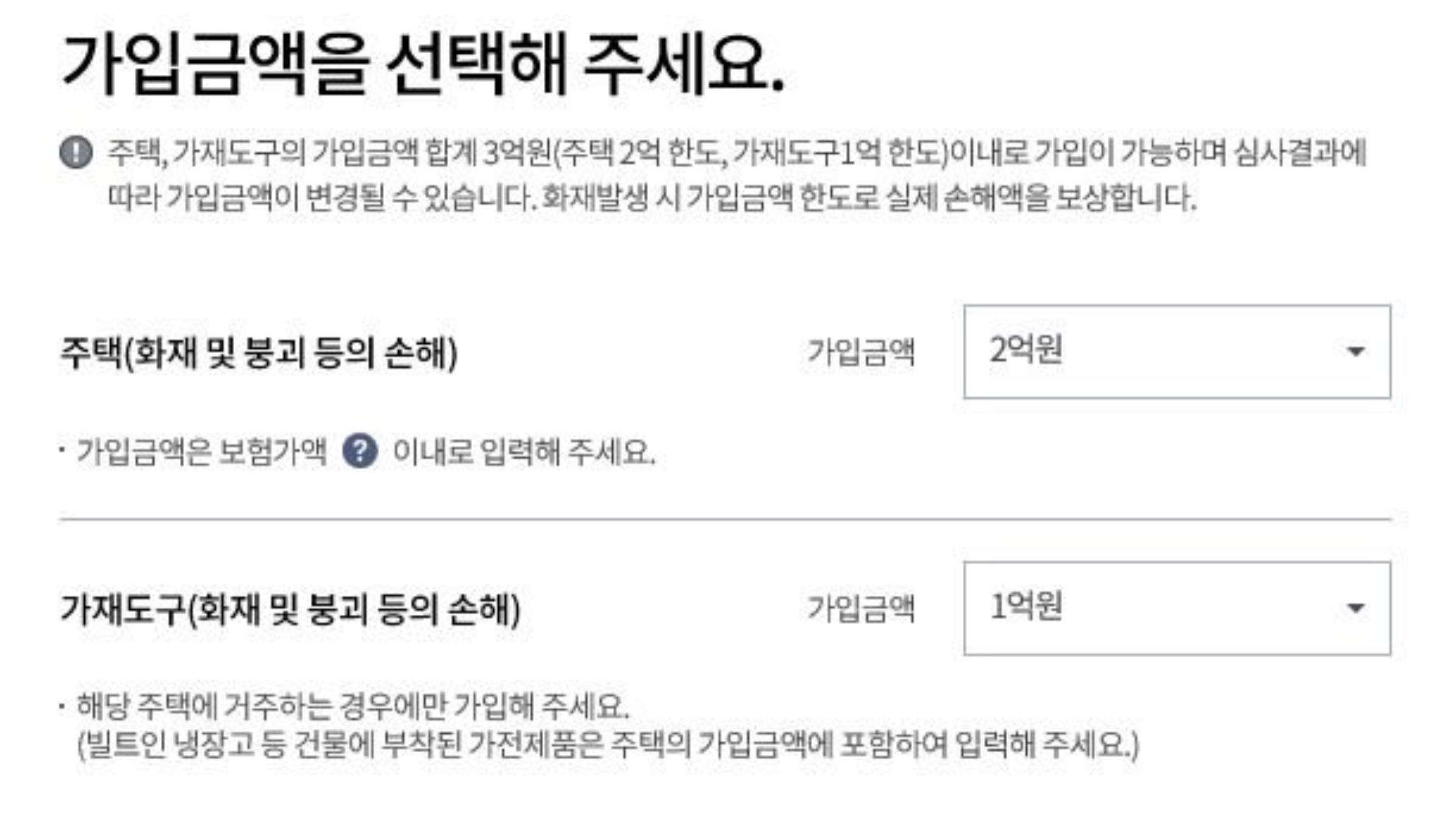 다음에는 보험 가입금액을 선택하시면 됩니다. 크게 주택과 가재도구 두 가지로 가입금액을 선택할 수 있으며, 주택은 2억원 한도, 가재도구는 1억원 한도입니다.