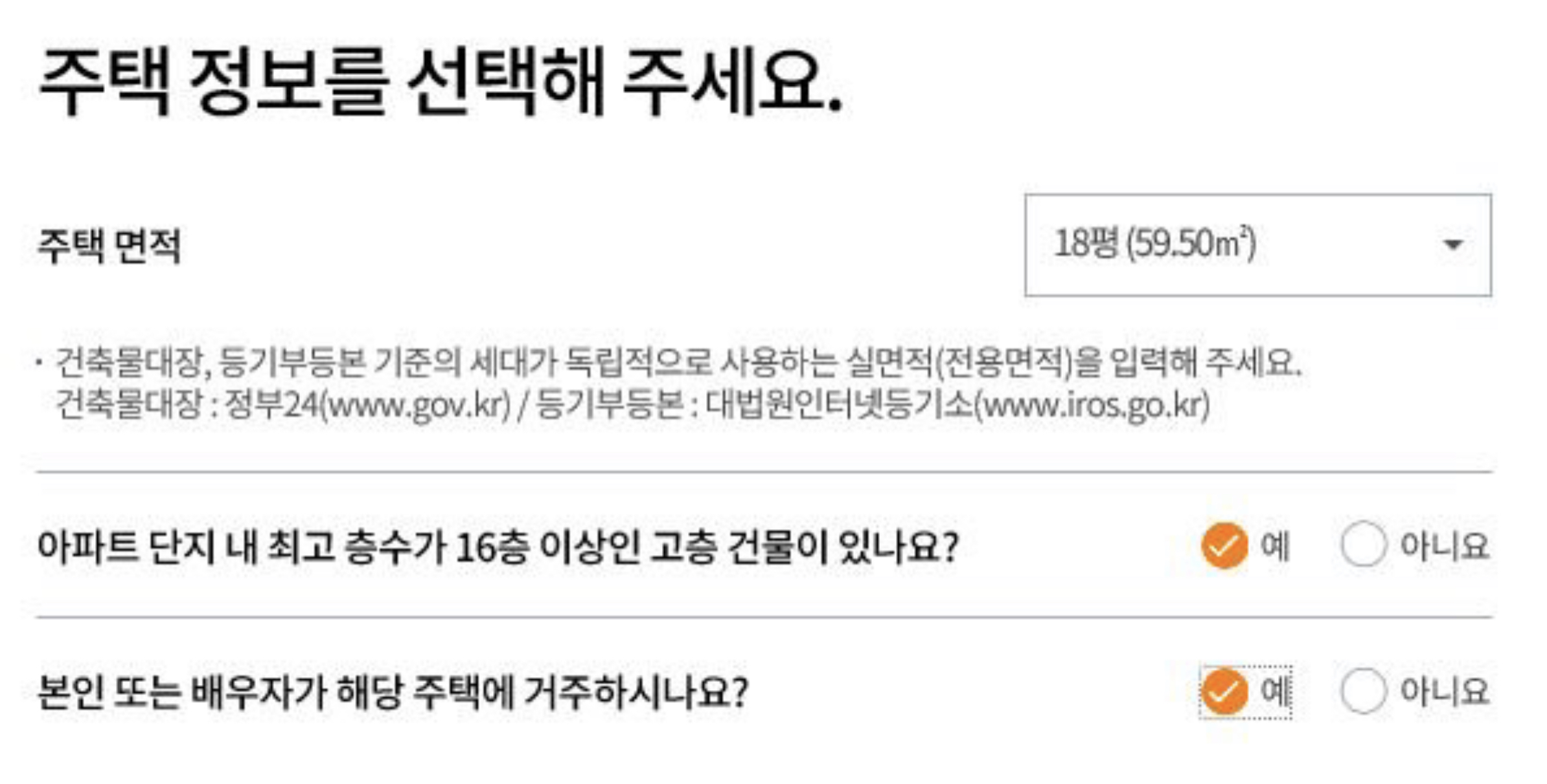다음에는 주택 정보를 입력해야 합니다. 주택면적과 아파트라면 단지 내 최고 층수가 16층 이상인 건물이 있는지, 그리고 실제 거주하고 있는지 여부를 체크하시면 됩니다. 이 때 주택면적은 실면적(전용면적)을 입력해주셔야 합니다.