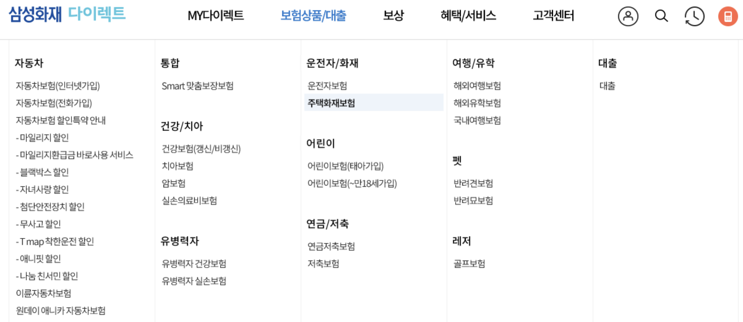 이 곳에서 보험상품/대출에서 주택화재보험을 클릭해서 들어가시면 아래와 같은 화면을 보실 수 있습니다.