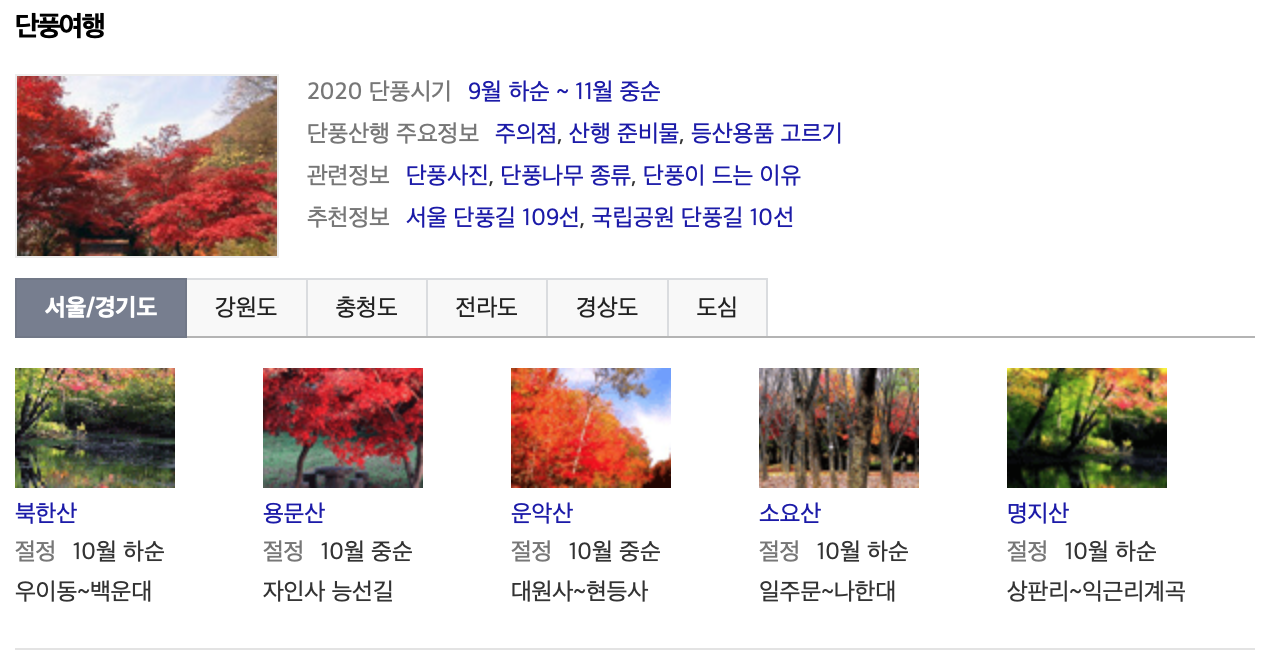 올 해는 아무래도 자유롭게 여행 다니는 것이 제한이 됩니다만 예전부터 단풍 구경으로 유명한 명소들이 여러곳이 있으니 단풍을 볼 계획이 있으신 분들은 참고하시면 좋을 것 같습니다. 전통적으로 단풍으로 유명한 곳 중 내장산이 유명한데 아래 다음에서 단풍 명소로 검색하면 나오는 검색 결과를 확인해보시기 바랍니다. 지역별로 잘 정리가 되어 있으며, 서울에서 단풍을 볼 수 있는 북한산이나 소요산도 포함되어 있습니다.